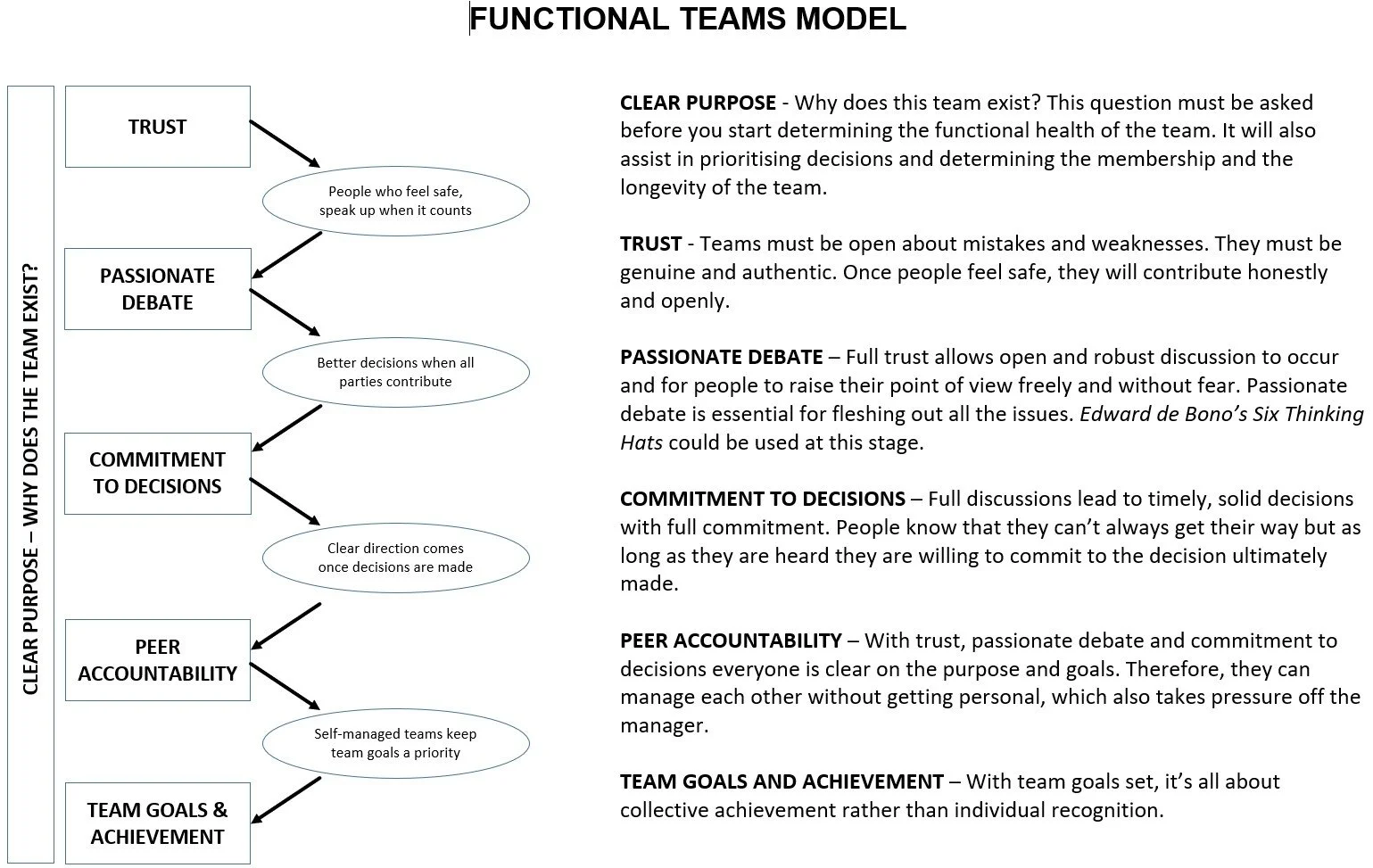 To flip Patrick’s work into making a functional team, see attached diagram. Essentially, we need to start with a CLEAR PURPOSE. Why does this team exist? This question must be asked before you start determining the functional health of the team. It will also assist in prioritising decisions and determining the membership and the longevity of the team.